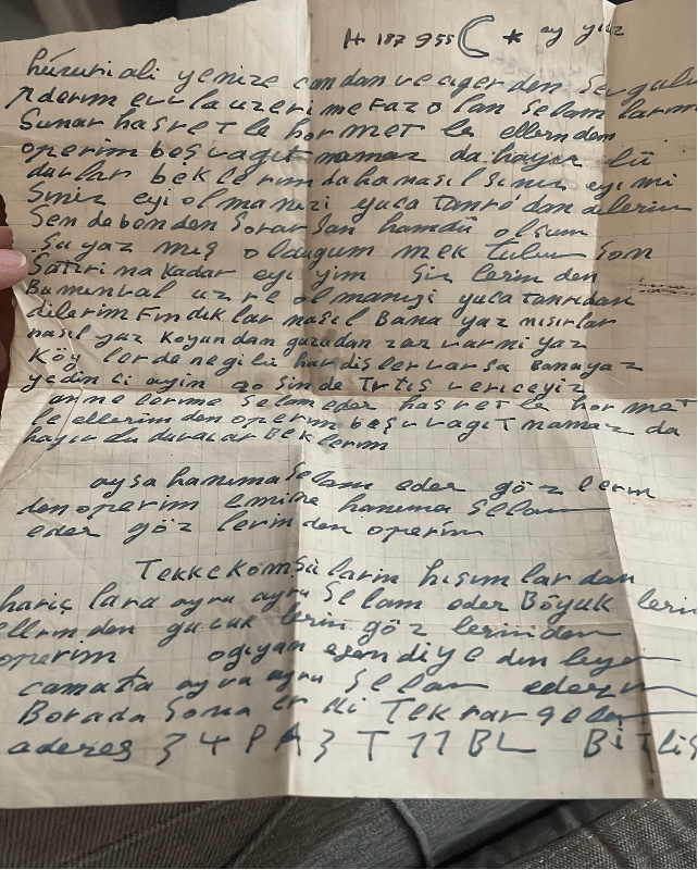 Huzuru âliyenize candan ve ciğerden sevgiler ederim. Evvela üzerime farz olan selamlarımı sunar, hasretle hürmetle ellerinizden öperim, beş vakit namazda hayır dualarınızı beklerim. Daha nasılsınız iyi misiniz? İyi olmanızı yüce Tanrı’dan dilerim. Sen de benden sorarsan hamdü olsun. Şu yazmış olduğum mektubun son satırına kadar iyiyim. Sizlerin de bu münasebette olmanızı yüce Tanrı’dan dilerim. Fındıklar nasıl bana yaz, mısırlar nasıl yaz, koyundan kuzudan zarar var mı yaz, Köylerde ne gibi havadisler varsa bana yaz, Yedinci ayın 20’sinde terhis vereceğiz. Annelerime selam eder hasretle hürmetle ellerinden öperim beş vakit namazda hayırlı dualarını beklerim.